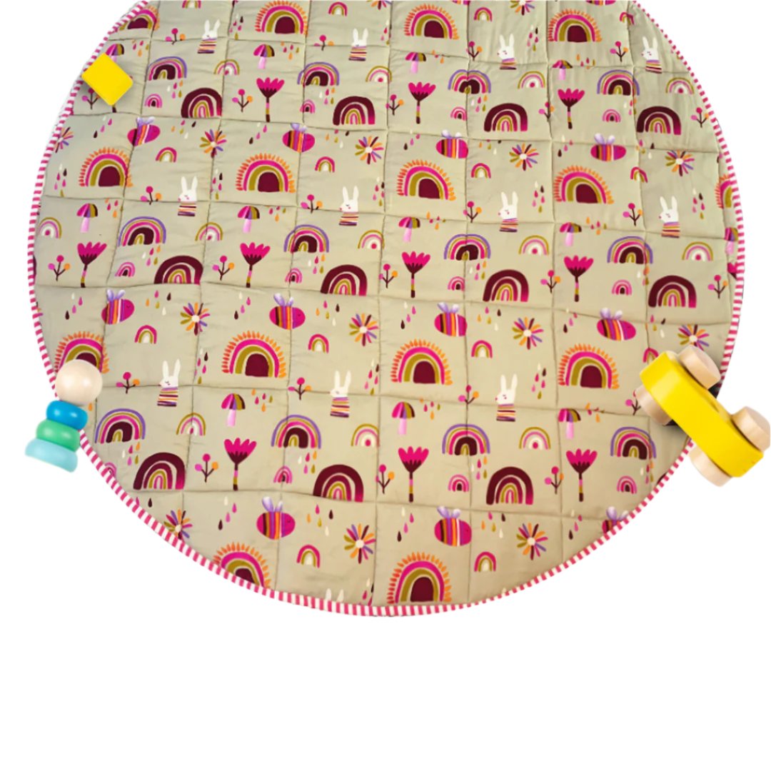 This playmate for babies and kids features a soft cotton top layer for comfort and a water-resistant underside to protect against spills. Lightweight and portable, it’s perfect for playdates, both indoors and outdoors. The play mat comes with a drawstring bag for easy storage and transport.